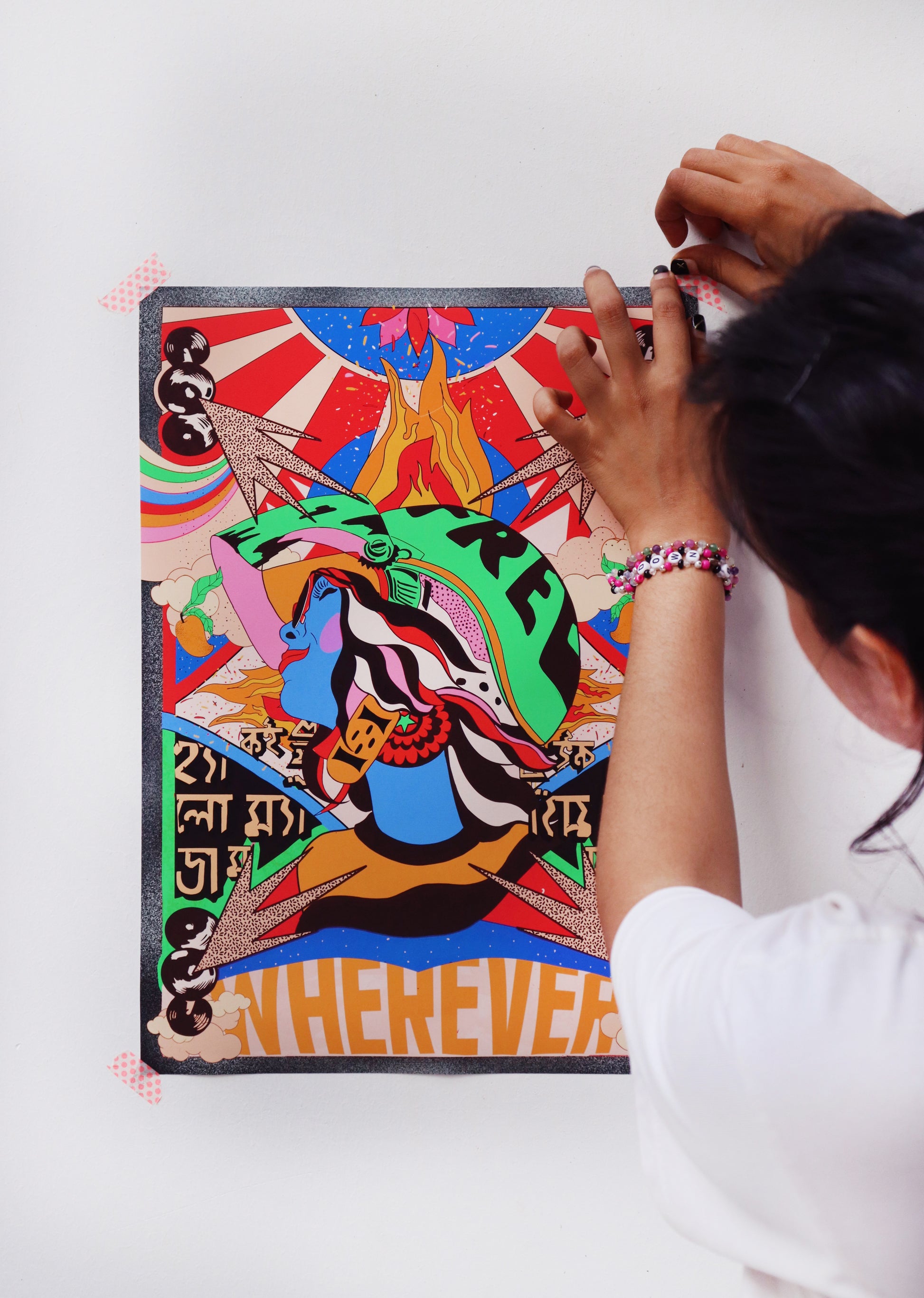 Navigating the streets of Dhaka require grit, a few shoulder shrugs, and plenty of eye rolls. With bulletproof skin and fire inside, sprinkled with ‘mayer doa’ (mother’s prayers), these fearless ladies keep moving no matter what. This artwork salutes the women who boldly embrace who they are and fight for their freedoms. They wear their hard hats (in real life or metaphorical) like crowns to keep the noise out.