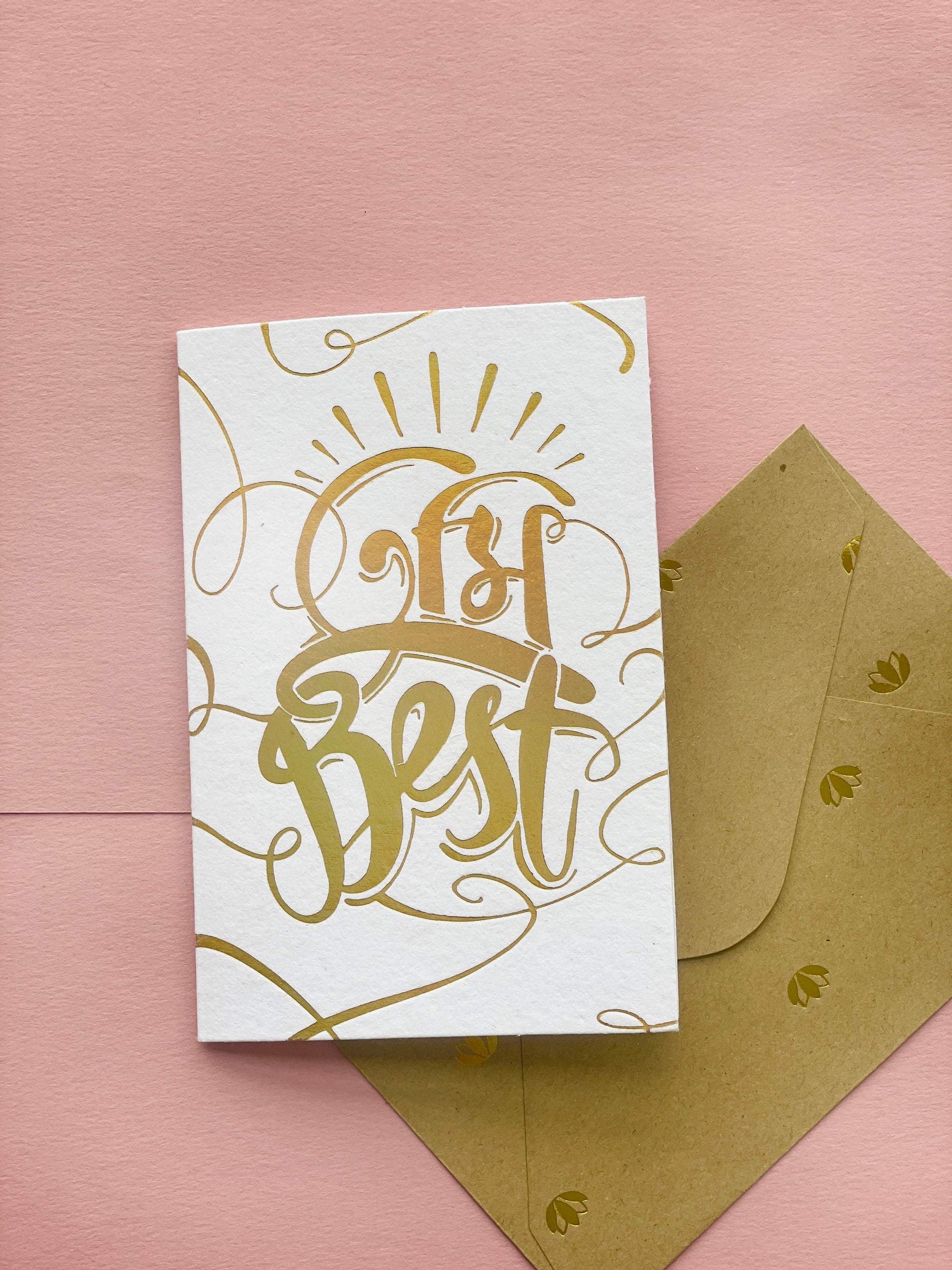 greeting card made with handmade paper and gold foil print fusing Bangla and English typography for your boo/bae/bestie/bff/bf/bruh and beyond